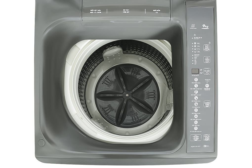 Máy giặt Aqua 9 kg AQW-F91GT S kiểu dáng đơn giản, hiện đại, khối lượng giặt 9 kg dùng cho gia đình 3 – 5 người, công nghệ Nano Ag+ hạn chế mảng bám và mùi hôi, sử dụng đơn giản nhờ bảng điều khiển song ngữ Anh – Việt, lựa chọn tốt cho gia đình.