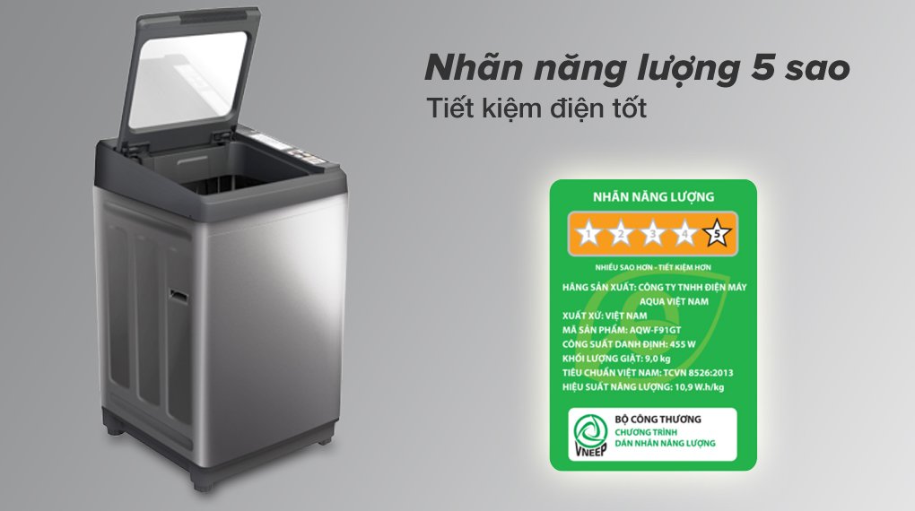 – Máy giặt Aqua đạt nhãn năng lượng 5 sao với hiệu suất sử dụng điện là 10.9 Wh/kg.