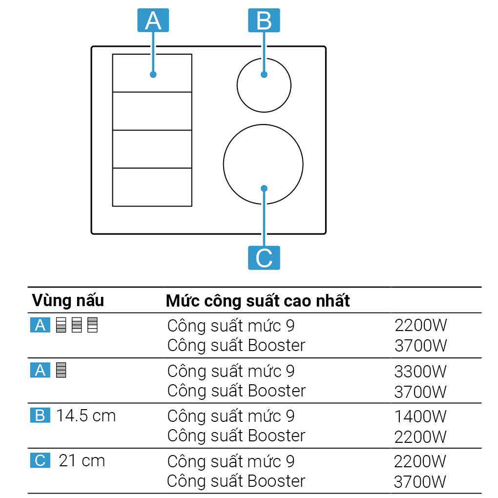 – Tổng công suất 7400W. Cả 4 vùng nấu đều được trang bị tính năng Booster gia nhiệt nhanh tuy nhiên trong quá trình hoạt động, các vùng nấu sẽ tự động chia sẻ công suất để đảm bảo không vượt quá công suất tổng, đảm bảo an toàn nguồn điện và tuổi thọ bếp. Trong đó cụ thể công suất từng vùng nấu như sau: