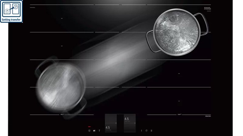 Setting TranferNếu bạn di chuyển nồi từ vùng nấu này sang vùng nấu khác khi nấu, mức nhiệt độ không cần phải được điều chỉnh riêng lẻ. Thay vào đó, vùng nấu mới áp dụng các cài đặt nhiệt độ và thời gian nấu cũ – tất cả những gì bạn cần là chạm vào nút để xác nhận. | ![]() ![]() |