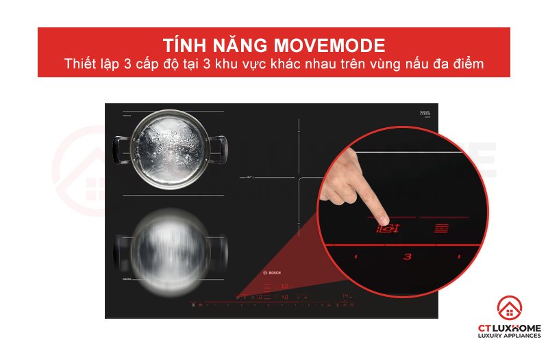 Bếp từ Bosch PXE801DC1E được trang bị tính năng MoveMode với thiết lập 3 mức cấp độ nhiệt khác nhau trên vùng nấu đa điểm.