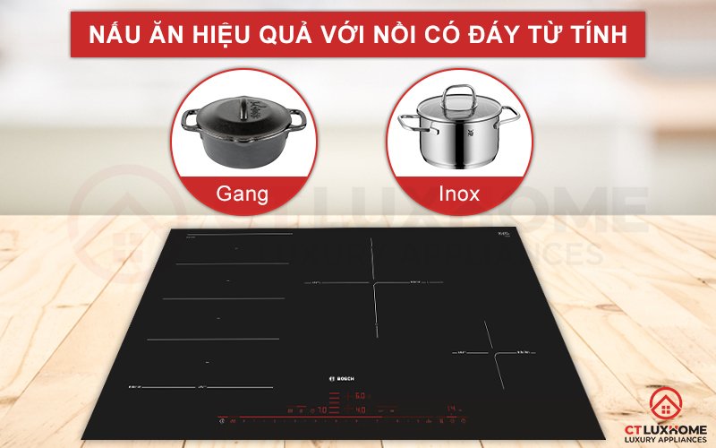 Để có thể nấu nướng ngay trên bếp từ Bosch PXE801DC1E, người dùng nên lựa chọn các loại nồi chảo có đế nhiễm từ. Nồi chảo được chọn phải được làm từ chất liệu như men sắt, gang, inox,… thì bếp mới có thể tiếp nhận và truyền nhiệt để nấu chín thức ăn.