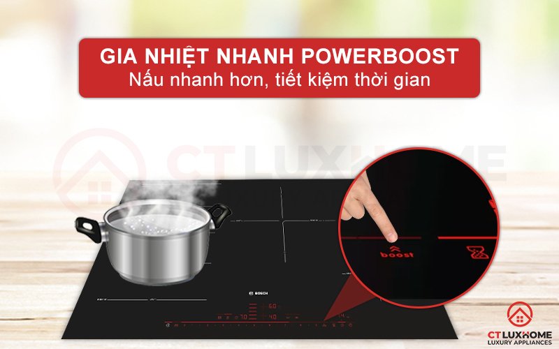 Bằng cách kích hoạt PowerBoost, mức nhiệt tại vùng nấu bạn chọn sẽ được đẩy lên cao nhất. Mức công suất nấu cũng sẽ tăng thêm 35% (tối đa 50%) so với mức công suất của vùng nấu đó. Nhờ vậy, bạn có thể dùng nó để đun nồi một nồi nước lớn trong khoảng thời gian ngắn.