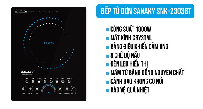 Với những tính năng thông minh, hiện đại và tiện lợi, bếp từ đơn Sanaky SNK-2303BT không chỉ là một sản phẩm nấu nướng mà còn là người bạn đồng hành đáng tin cậy trong mỗi bữa ăn của gia đình bạn.