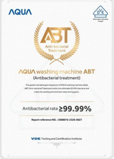Mâm giặt kháng khuẩn ABT trên máy giặt Aqua được VDE công nhận có thể ngăn ngừa vi khuẩn, nấm mốc 99.99%.