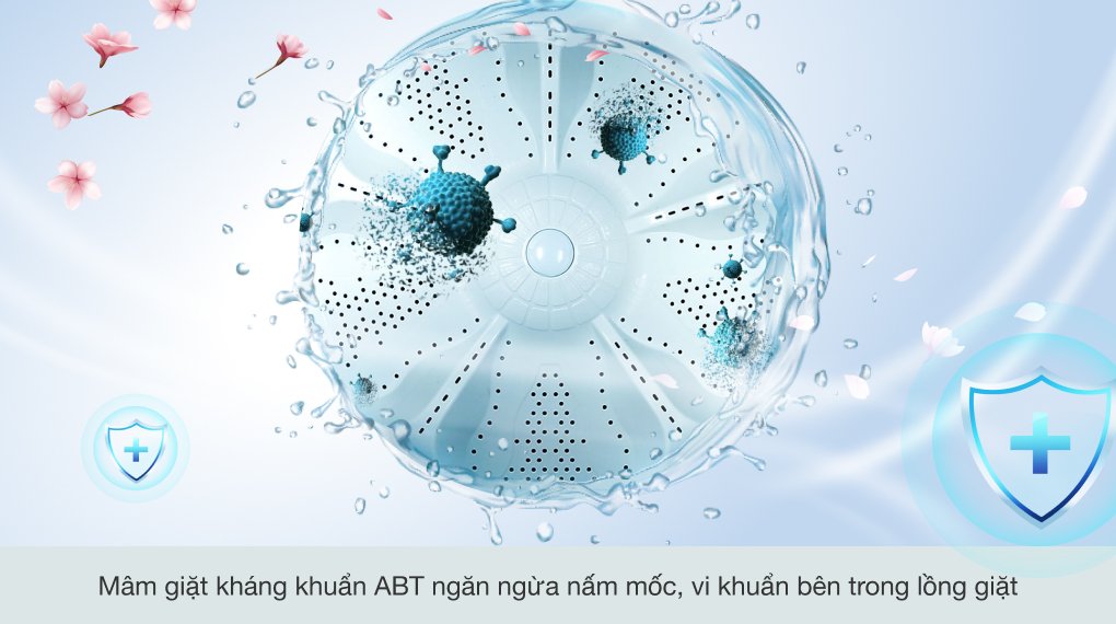 Mâm giặt kháng khuẩn ABT được phun một chất liệu đặc biệt có khả năng kháng khuẩn, ngăn chặn sự sinh sôi của vi khuẩn lên tới 99.99%. Nhờ đó bạn hoàn toàn có thể yên tâm khi sử dụng máy giặt cửa trên này.