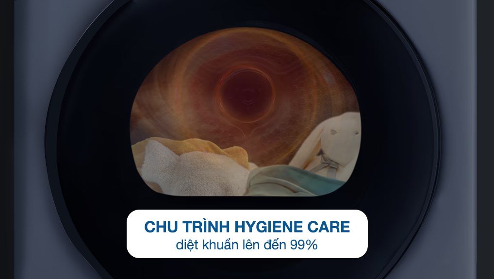 – Sấy diệt khuẩn Hygiene Care: tiêu diệt vi khuẩn đến 99% bằng cách truyền nhiệt độ trong quy trình sấy, ngăn chặn vi khuẩn tích tụ trên đồ dùng, quần áo, cả đồ khô và ướt mà không tác động đến hiệu suất sấy.
