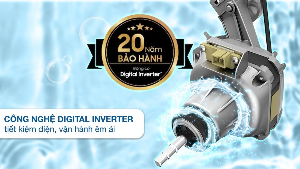 – Trang bị công nghệ Digital Inverter với động cơ tích hợp nam châm vĩnh cửu có tác dụng hạn chế ma sát trong quá trình vận hành từ đó giúp thiết bị hoạt động êm ái, bền bỉ, giảm độ ồn. Động cơ Digital Inverter của Samsung được bảo hành lên đến 20 năm.