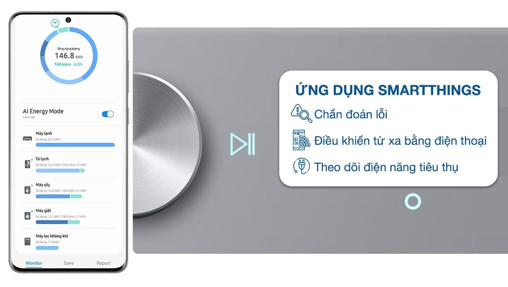 – Kết nối điện thoại qua app SmartThings: app này cho phép người dùng quản lý thiết bị mọi lúc mọi nơi mà không cần tiếp cận gần với máy sấy. SmartThings còn đưa ra gợi ý những chu trình, chỉ dẫn thông minh để khắc phục các sự cố, theo dõi và giảm mức tiêu hao năng lượng thông qua SmartThings AI Energy.