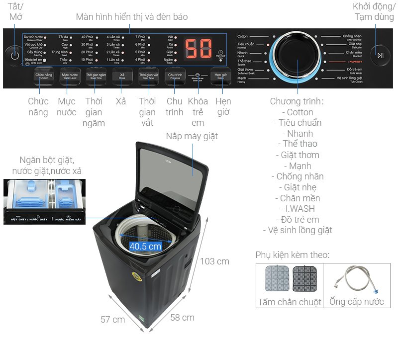 Mâm giặt kép Twin PulsatorMâm giặt kháng khuẩn ABTLồng giặt PillowChế độ giặt lưu hương thơm
