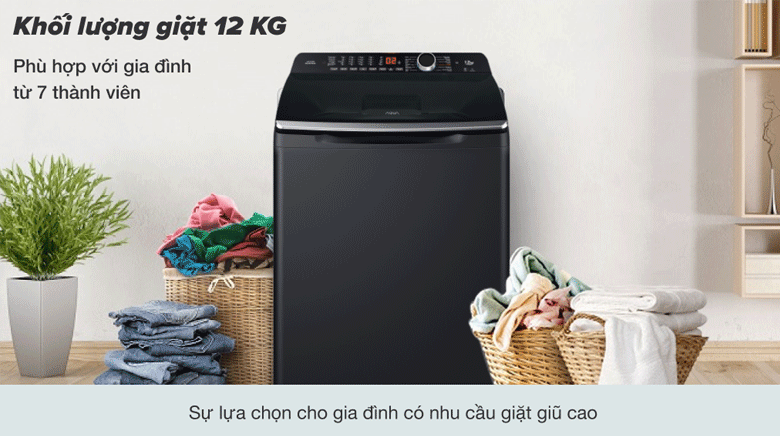– Khối lượng giặt tối đa 12 kg, máy phù hợp sử dụng cho nhu cầu giặt giũ của các gia đình trên 7 thành viên, hoặc các gia đình có ít thành viên hơn nhưng nhu cầu giặt giũ cao, có thói quen để dồn quần áo giặt 1 lần trong tuần nhằm tiết kiệm điện nước.