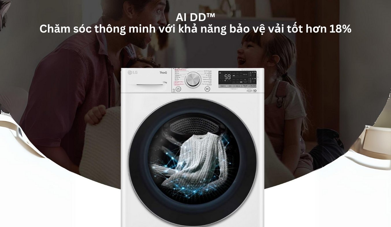 Máy giặt LG Inverter 11 kg FV1411S4WA ứng dụng công nghệ giặt bằng cảm biến thông minh AI DD™ nhằm bảo vệ quần áo tốt hơn trong quá trình giặt, giúp người dùng giải quyết nỗi lo quần áo sờn mòn, hư hỏng khi giặt máy. Cụ thể, AI DD™ bao gồm hệ thống các cảm biến thông minh cho phép nhận biết trọng lượng và độ mềm hay cứng của các chất liệu vải. Dựa trên kết quả thu thập được, máy giặt tiến hành tự lựa chọn chương trình giặt và các chuyển động phù hợp nhất để đảm bảo giặt sạch tối ưu mà vẫn không tác động quá nhiều đến quần áo để bảo vệ chúng. Qua kiểm nghiệm, LG cho biết công nghệ AI DD™ chăm sóc sợi vải tốt hơn đến 18% so với máy giặt không có công nghệ này.