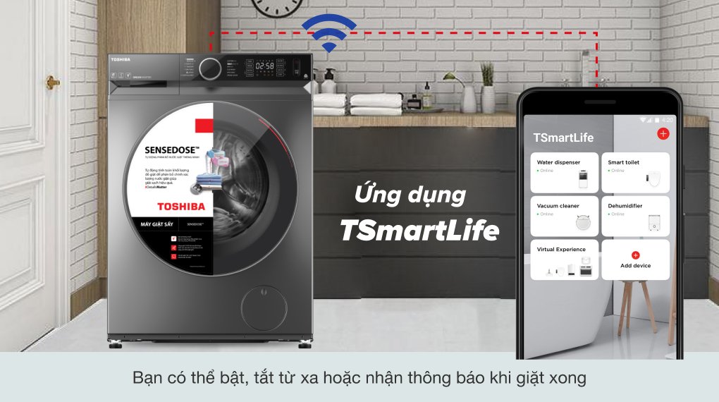 – Kết nối Wifi và điều khiển từ xa bằng điện thoại thông minh qua ứng dụng TSmartLife: cài đặt ứng dụng này vào thiết bị di động của mình, kết nối với máy giặt là bạn có thể quản lý hoạt động thiết bị, theo dõi chương trình giặt và sử dụng các tiện ích khác dễ dàng.