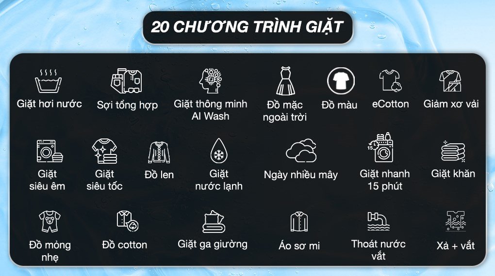 – Trang bị 20 chương trình giặt khác nhau như: eCotton, giặt thông minh AI Wash, sợi tổng hợp, đồ màu, đồ mặc ngoài trời, giảm xơ vải, giặt hơi nước, giặt khăn, giặt nhanh 15 phút, giặt nước lạnh, giặt siêu tốc, giặt siêu êm,… hỗ trợ giải quyết tốt nhiều loại quần áo khác nhau trong gia đình, giúp quần áo tăng thêm tuổi thọ sử dụng.