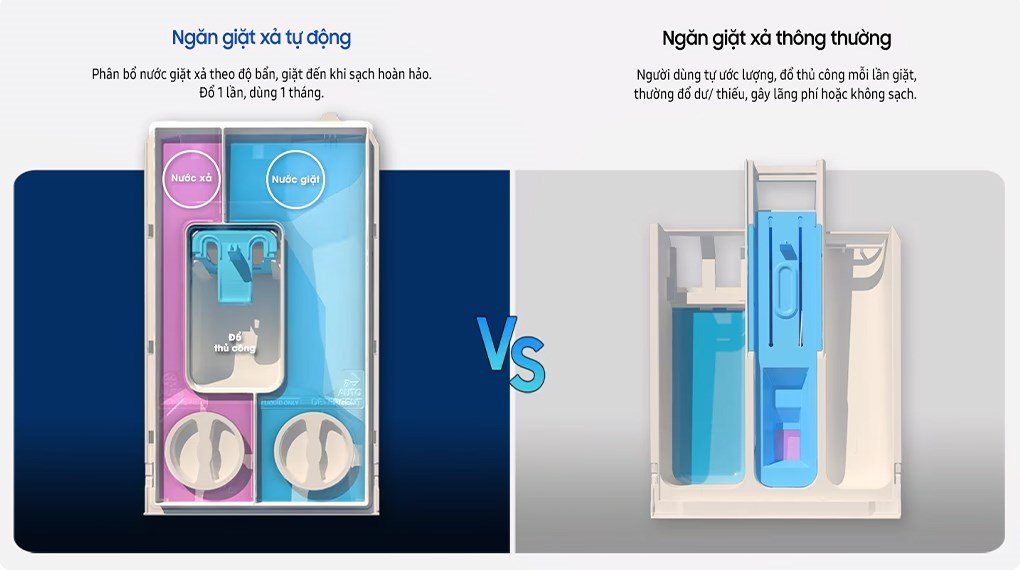 – AI Dispenser tự động cân chỉnh lượng nước giặt, nước xả