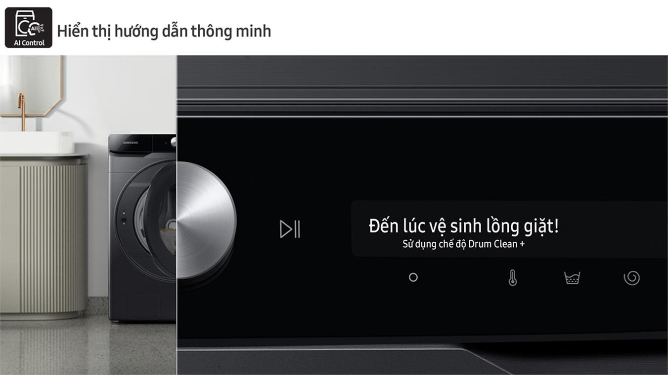 Bảng điều khiển AI tự động ghi nhớ, phân tích, đề xuất chế độ giặt và cài đặt yêu thích dựa trên thói quen sử dụng, mà không cần tùy chỉnh mỗi lần giặt. Màn hình hiển thị quy trình giặt dễ hiểu, hướng dẫn thông minh và kết nối với điện thoại qua ứng dụng SmartThings* điều khiển máy giặt mọi lúc mọi nơi.