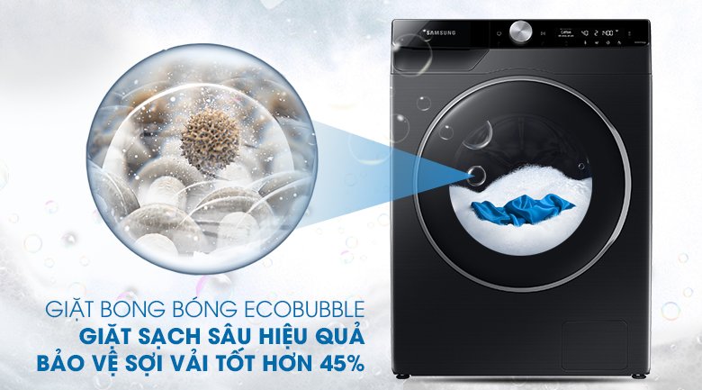 Chiếc máy giặt Samsung được áp dụng công nghệ bong bóng Eco Bubble – công nghệ độc đáo nhất của thương hiệu Samsung với đồ giặt giũ. Công nghệ Eco Bubble giúp hòa tan bột giặt và tạo ra nhiều bọt xà phòng siêu mịn. Bọt xà phòng sẽ thấm nhanh và sâu vào trong từng sợi vải nhanh gấp 40 lần so với máy giặt thông thường giúp làm sạch ngay vết bẩn trên quần áo hiệu quả tốt hơn 24%, bảo vệ áo quần bền màu tốt hơn lên đến 45%, đồng thời tiết kiệm được lượng bột giặt đáng kể.