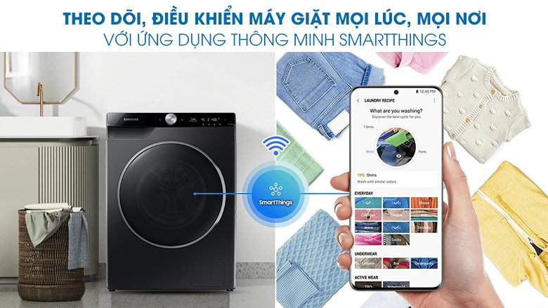 Ứng dụng SmartThings cho phép người dùng có thể theo dõi chiếc máy giặt Samsung ở bất cứ địa điểm và thời gian nào, ngay cả khi không ở nhà. Tính năng này vô cùng tiện lợi, người sử dụng có thể chủ động điều khiển được thời gian giặt bất cứ khi nào và đưa ra các gợi ý lựa chọn chương trình giặt dựa theo thói quen sử dụng giúp tiết kiệm được nhiều thời gian để có thể nghỉ ngơi hay làm những công việc gia đình khác.