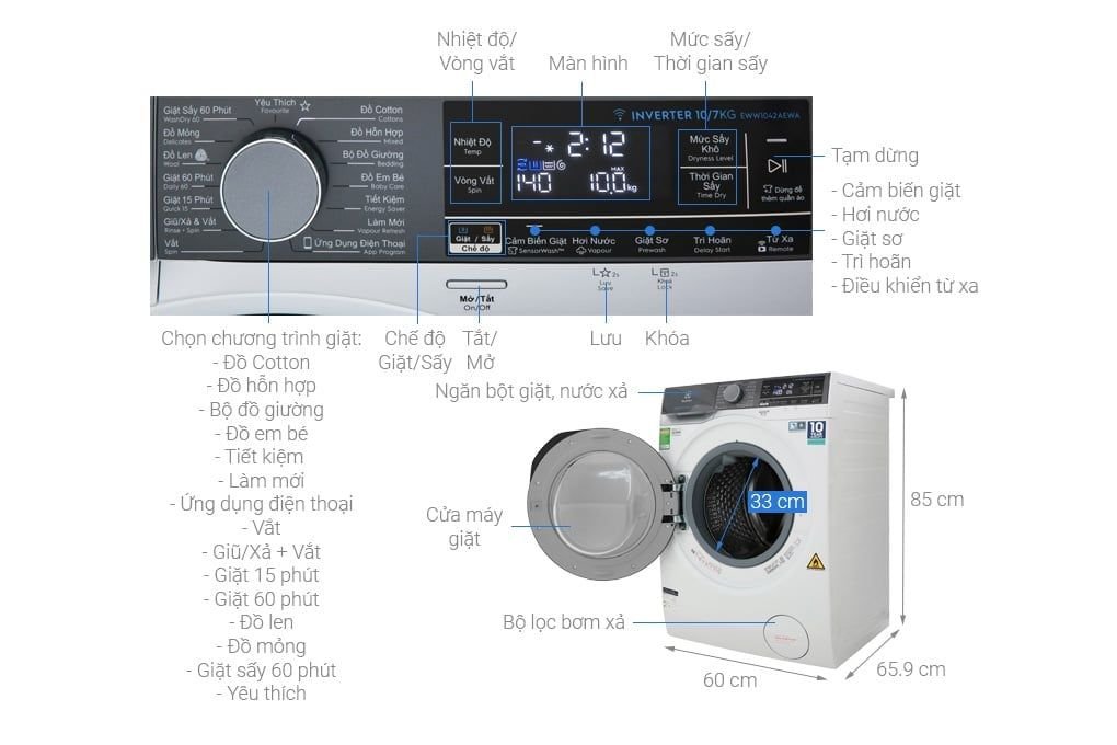 Thông số kỹ thuật Máy giặt sấy Electrolux Inverter 10 kg EWW1042AEWA