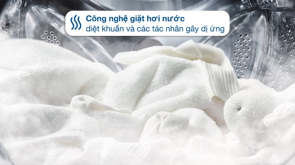– Máy giặt được tích hợp công nghệ giặt hơi nước Steam, có khả năng dùng hơi nước nóng để thẩm thấu qua từng sợi vải, giúp loại bỏ các tác nhân gây dị ứng bám trên quần áo một cách nhẹ nhàng cũng như khử trùng hiệu quả, bảo vệ làn da tối ưu cho bạn.