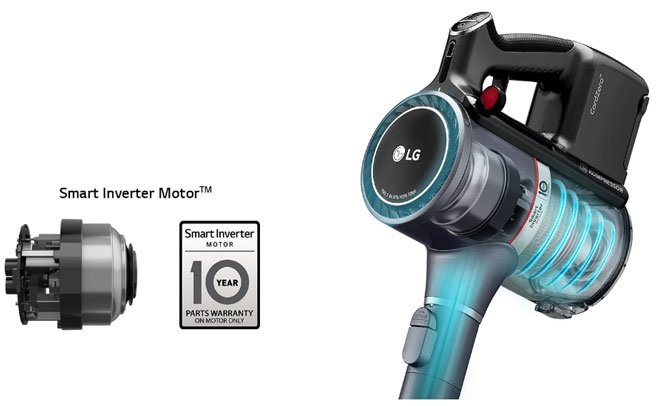 Động cơ không chổi Smart Inverter Motor ™ quay ở tốc độ cao mang đến công suất hút mạnh mẽ có thể nâng các hạt bụi bẩn lên một cách dễ dàng. Axial Turbo Cyclone ™ sau đó tạo ra các luồng gió xoáy nhỏ bên trong máy để tách và lọc các hạt bụi.Thiết kế động cơ không chổi giúp giảm tối đa ma sát cơ học trong quá trình hoạt động, cải thiện độ bền của động cơ. Nhờ vậy, LG tự tin mang đến chế độ bảo hành bộ phận động cơ lên đến 10 năm.
