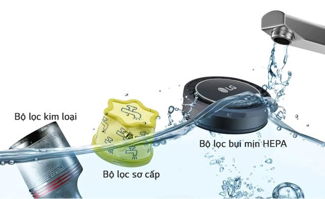 *Chỉ áp dụng cho Máy hút bụi thanh dài LG CordZero™. Sau khi rửa sạch, hãy đảm bảo các bộ lọc khô hoàn toàn trước khi lắp lại. Thời gian để khô có thể thay đổi theo mùa, nhiệt độ hoặc độ ẩm.