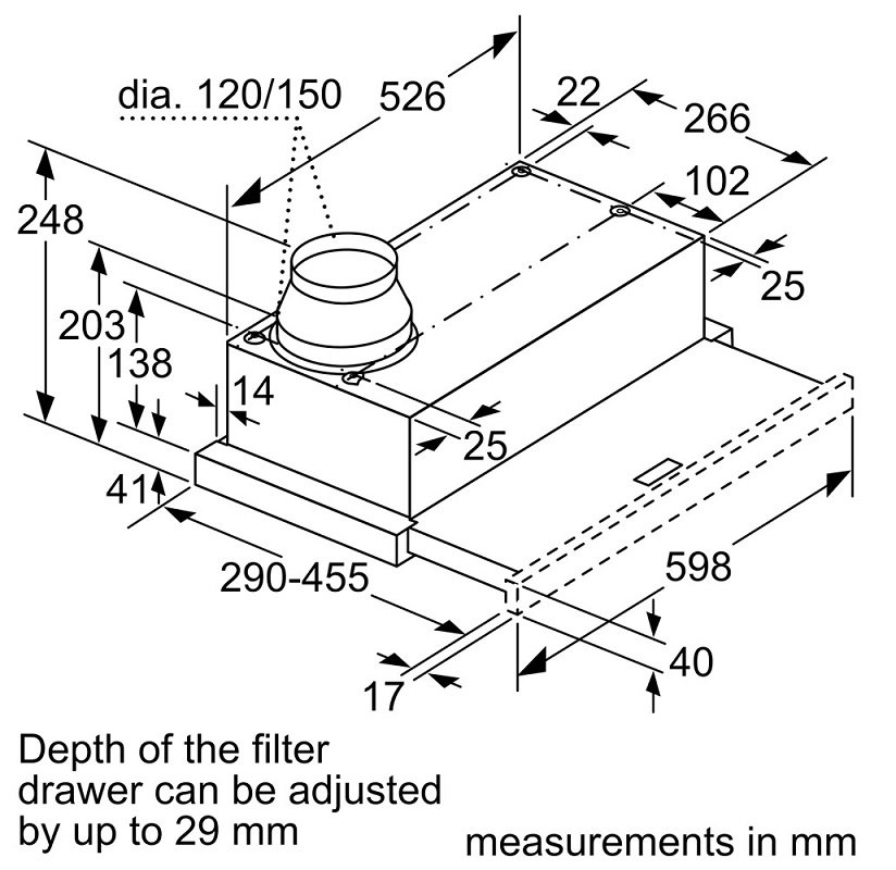 Để có thể phù hợp với nhiều kiểu không gian bếp, máy hút mùi Bosch rộng 60cm nên khá tiết kiệm diện tích. Đường ống thoát khí đi kèm máy có đường kính 150mm/120mm giúp khí lưu thông dễ dàng.