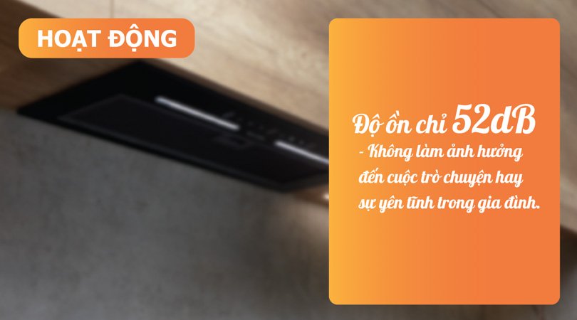 Độ ồn của máy hút mùi âm tủ Malloca chỉ là 52dB, giúp cho hoạt động của máy không làm ảnh hưởng đến cuộc trò chuyện hay sự yên tĩnh trong gia đình. Công suất hút đạt mức ổn định, mang lại không gian bếp sạch sẽ và thoải mái.