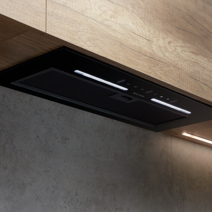 Malloca không chỉ là một thiết bị hữu ích trong nhà bếp, mà còn là một điểm nhấn đầy ấn tượng với chất liệu kính đen sang trọng. Kích thước máy hút (W697 x D287 x H250 mm) và kiểu lắp treo âm tủ cho phép máy hút mùi dễ dàng hòa nhập vào không gian nhà bếp của bạn.