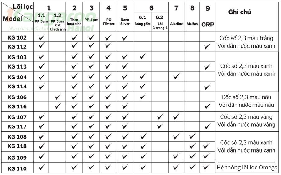 2. Bảng các model và tính năng các lõi lọc