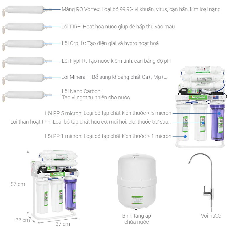 – Máy lọc nước Kangaroo Hydrogen KGRP09HQ 9 lõi – Công suất lọc 10 – 12 lít/giờ, tích hợp bình chứa nước dung tích 10 lít