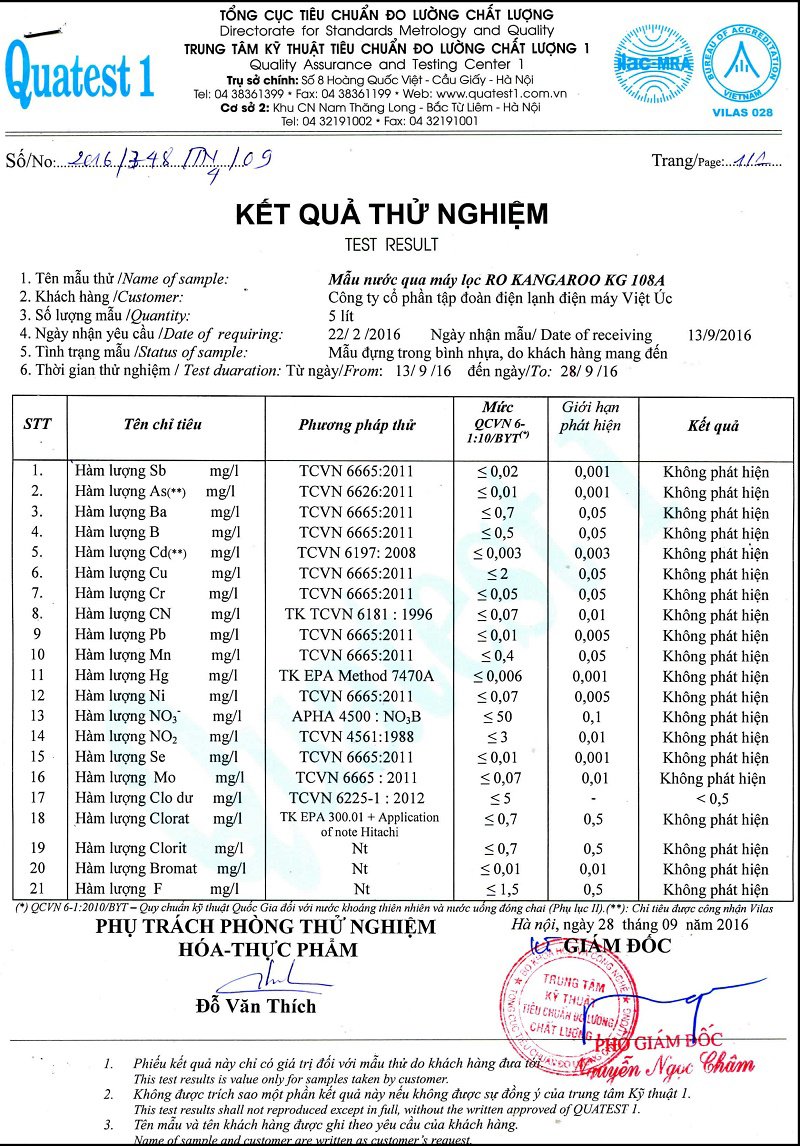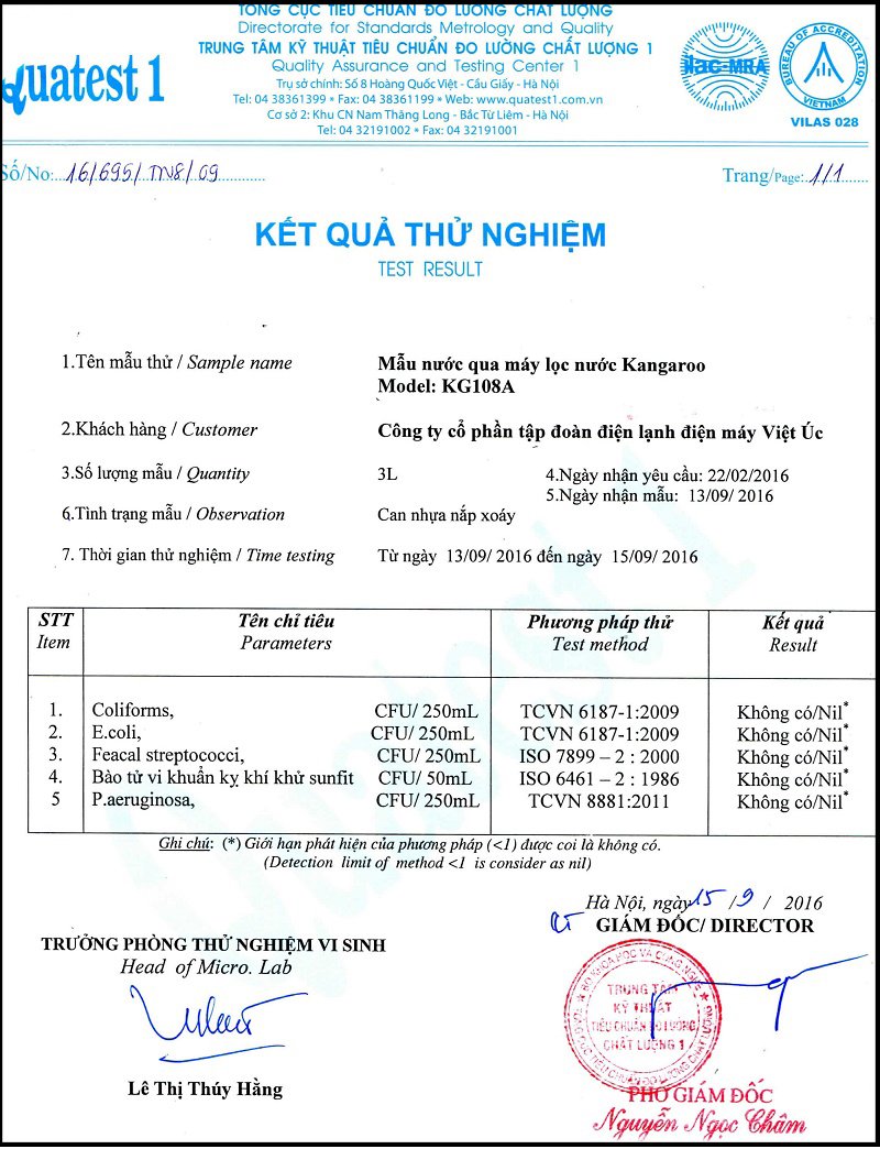 Giấy chứng nhận chất lượng nước đầu ra của máy lọc