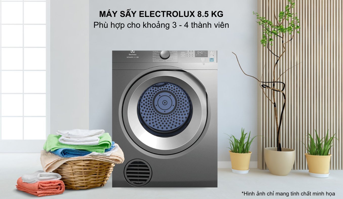 Khối lượng sấy 8.5 kg, phù hợp cho khỏang 3 – 4 thành viên