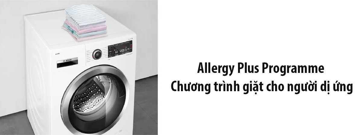 Với chương trình AllergyPlus, nhiệt độ giặt được duy trì ổn định trong suốt quá trình giặt, đáp ứng chuẩn vệ sinh cực cao. Chương trình này hiệu quả trong việc loại bỏ vi khuẩn và các tác nhân gây kích ứng như mạt bụi. Ngoài ra, nước giặt cũng được sử dụng để xả sạch hoàn toàn, giảm thiểu bột giặt còn sót lại và đảm bảo vấn đề vệ sinh.