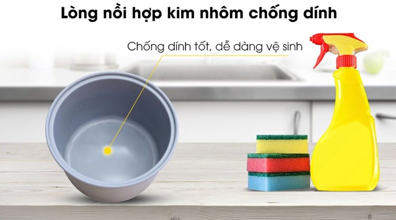 Lòng nồi làm từ hợp kim nhôm được phủ lớp chống dính, giúp cơm không cháy khét và bám dính, dễ vệ sinh, đảm bảo an toàn cho người sử dụng