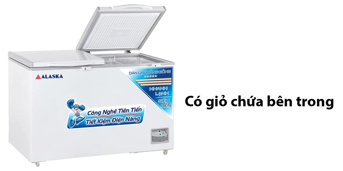 Sản phẩm còn đi kèm với giỏ chứa bên trong tủ, giúp bạn tổ chức và phân loại thực phẩm một cách ngăn nắp và thuận tiện. Giỏ này giúp tối ưu hóa không gian bên trong tủ đông Alaska HB-550C, người dùng dễ dàng sắp xếp và tìm kiếm các sản phẩm mà mình cần.