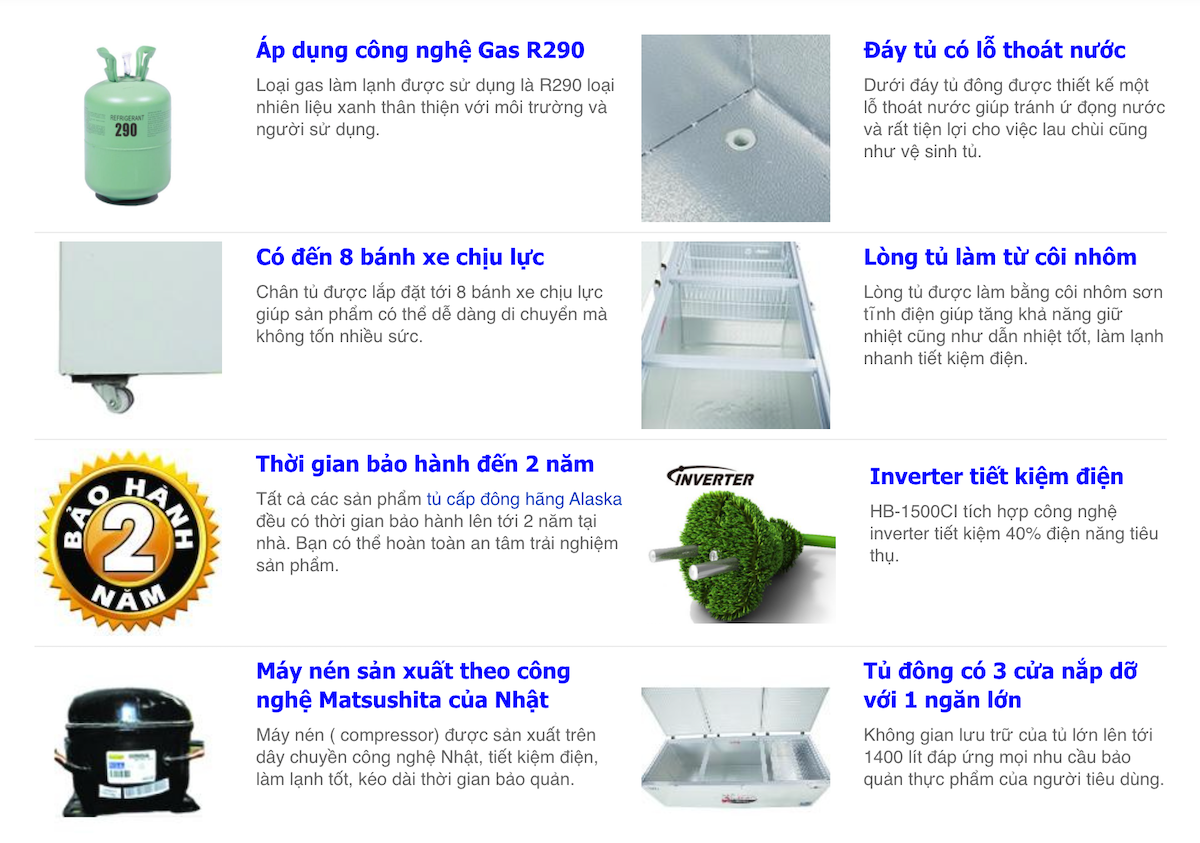 Tủ đông Alaska HB-1500CI thuộc dùng tủ đông 1 ngăn 3 cánh mở cỡ lớn mới nhất của hãng Alaska. Dung tích 1500 lít, sản phẩm thích hợp sử dụng để bảo quản thực phẩm cho các siêu thị, nhà hàng, quán ăn lớn… có nhu cầu trữ đông cao. Sản phẩm được sản xuất theo tiêu chuẩn Châu Âu, dàn lạnh ống đồng, lành lạnh nhanh, tích hợp công nghệ inverter tiết kiện điện năng, tủ chuyên trữ đông thực phẩm với số lượng lớn.