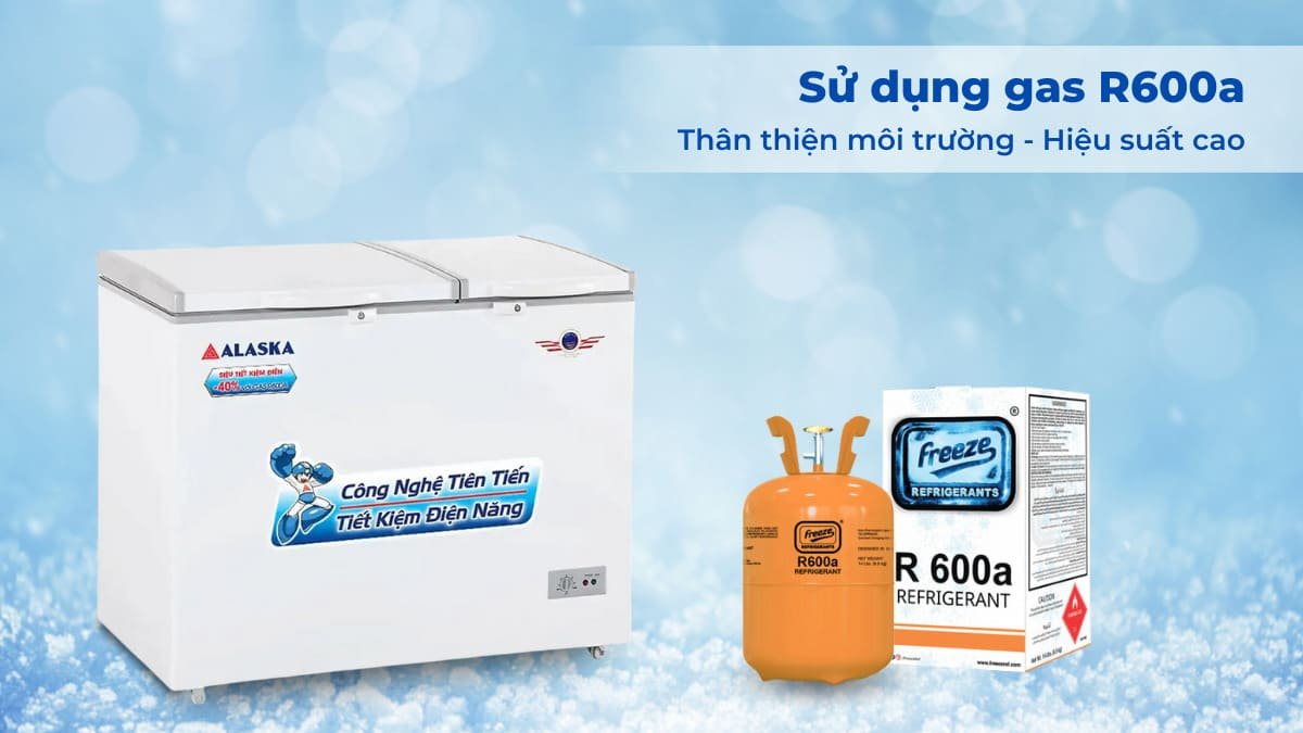 Tủ Đông Mát Alaska 210 Lít BCD-3571 đã sử dụng gas R600a để làm lạnh. R600a vốn được biết đến là dòng gas thế hệ mới, có hiệu suất làm lạnh cao, nhờ đó máy nén không phải hoạt động quá nhiều vẫn cung cấp đủ hơi lạnh cho toàn bộ thực phẩm. Vì vậy việc sử dụng gas R600a sẽ giúp cho tủ đông Alaska này giảm thiểu lượng điện tiêu thụ đáng kể. Ngoài ra, gas R600a không chứa các chất gây ảnh hưởng đến tầng Ozon cũng như là môi trường nên người dùng có thể an tâm sử dụng trong thời gian dài.
