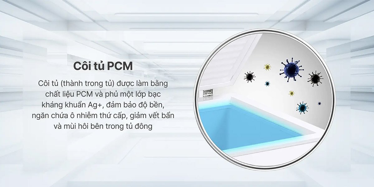 Côi tủ (thành trong tủ) chế tạo từ chất liệu PCM và được phủ một lớp bạc chống khuẩn Ag+, đảm bảo độ bền cao. Chất liệu này không chỉ ngăn chặn ô nhiễm thứ cấp mà còn giảm thiểu vết bẩn và mùi hôi bên trong tủ đông. Lớp bạc kháng khuẩn Ag+ đặc biệt hiệu quả trong việc duy trì môi trường an toàn cho thực phẩm và ngăn chặn sự phát triển của vi khuẩn, giữ cho thực phẩm luôn tươi ngon và an toàn khi bảo quản trong tủ.