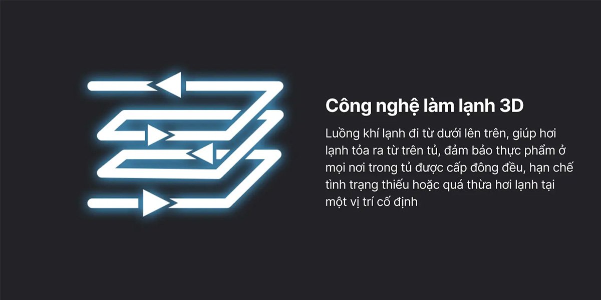 Công nghệ làm lạnh 3D được Aqua thiết kế sao cho luồng khí lạnh di chuyển từ dưới lên trên, giúp hơi lạnh tỏa ra từ phía trên của tủ. Cơ chế này đảm bảo rằng thực phẩm ở mọi nơi trong tủ đều được cung cấp độ lạnh một cách đồng đều. Công nghệ này giảm thiểu tình trạng thiếu hoặc quá thừa hơi lạnh tại các vị trí cố định, mang lại hiệu suất làm lạnh tối ưu.
