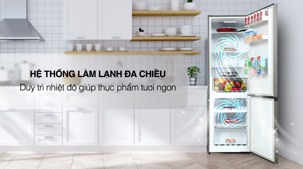 – Hệ thống làm lạnh đa chiều giúp hơi lạnh được phân bổ đều đến các ngăn, giữ rau củ được tươi ngon lâu hơn.