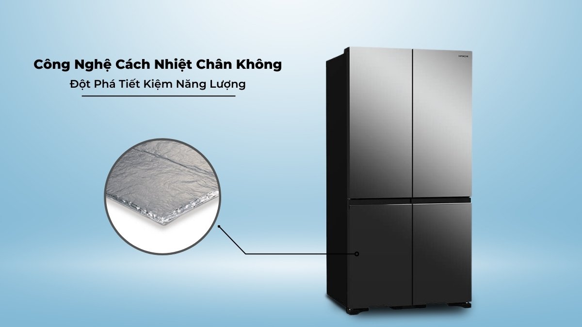 Tủ lạnh Hitachi sử dụng vật liệu VIP- tấm mỏng với lớp chân không bằng sợi thủy tinh rất mịn màng mang đến hiệu quả cách nhiệt cao, ngăn nhiệt thoát ra bên ngoài, tiết kiệm năng lượng tối ưu. Thời gian giữ lạnh có thể lên đến 15 giờ kể cả khi mất điện.