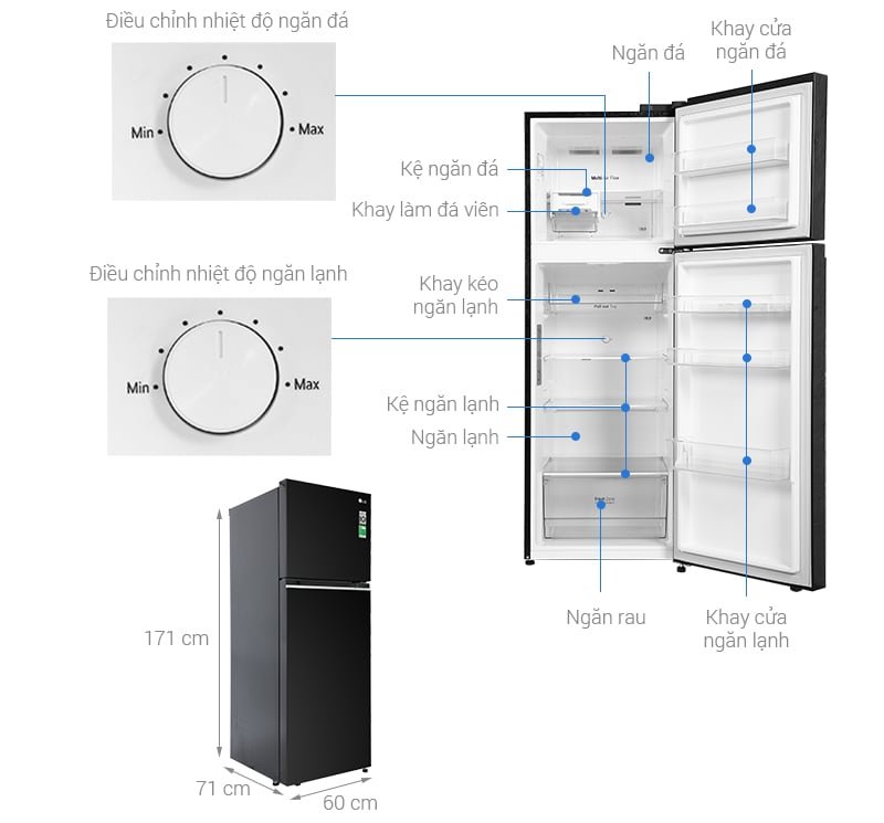 Kích thước tủ lạnh: | Cao 171 cm – Rộng 60 cm – Sâu 71 cm – Nặng 60 kg |