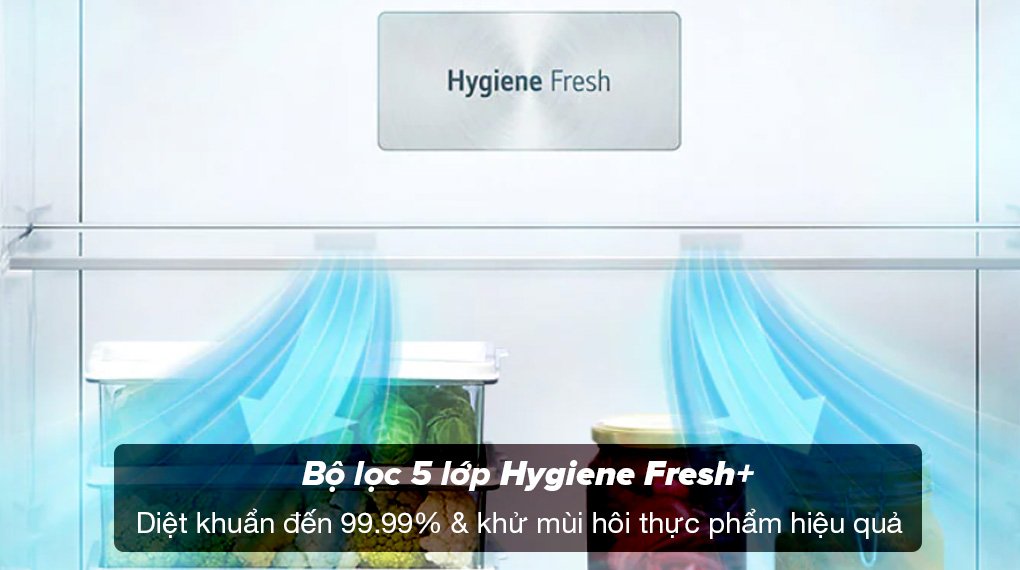 Bộ lọc 5 lớp Hygiene Fresh+™: Có khả năng diệt khuẩn đến 99.99% và khử mùi hiệu quả, giúp không khí bên trong tủ lạnh luôn sạch sẽ và thông thoáng, góp phần duy trì độ tươi ngon thực phẩm tốt hơn và mang lại cảm giác cho bạn thoải mái mỗi khi mở cửa tủ lạnh LG.