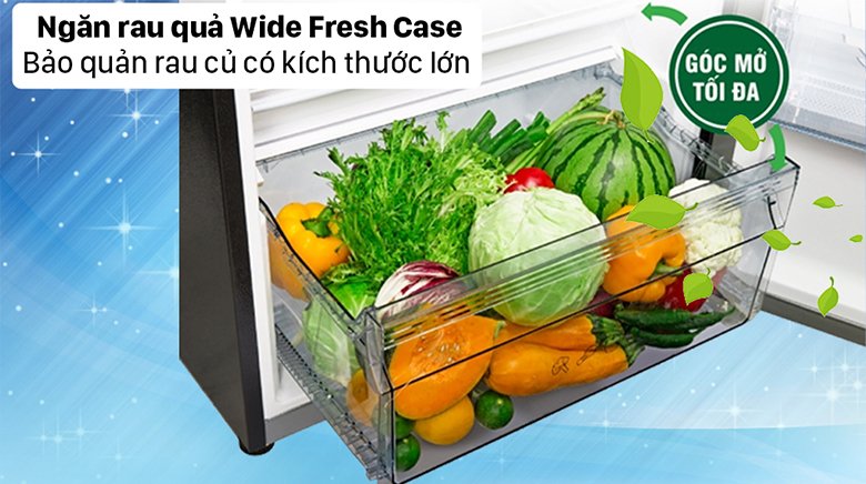 Tủ lạnh Panasonic NR-TL351GPKV có ngăn rau quả Wide Fresh Case dung tích lớn với góc mở rộng tối đa, ngăn chứa cho phép bạn trữ nhiều rau củ quả kích thước lớn hơn so với ngăn rau quả thông thường khác. Cấu trúc khép kín giúp duy trì ẩm tốt đồng thời ngăn hơi lạnh thổi trực tiếp giữ rau quả tươi ngon lâu hơn.