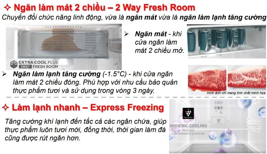 Tiện ích : Chế độ làm lạnh nhanh Extra Cool, Chế độ cấp đông nhanh Express Freezing, Chuông báo cửa