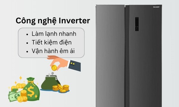Công nghệ Inverter tiết kiệm điện hiệu quảSở hữu chiếc tủ lạnh Sharp trang bị công nghệ Inverter này, chị em nội trợ sẽ giảm bớt đi những nỗi lo hóa đơn tiền điện mỗi tháng. Bởi tủ ứng dụng công nghệ Inverter không những giúp làm lạnh nhanh mà còn tiết kiệm điện năng, giảm thiểu tiếng ồn và giảm hao mòn động cơ để kéo dài tuổi thọ cho máy.