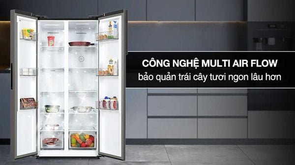 Luồng khí lạnh đa chiều Multi Air Flow: Khí lạnh thoát ra từ nhiều cửa hơi lạnh và lan tỏa đều khắp mọi ngóc ngách bên trong tủ. Nhờ đó làm lạnh thực phẩm toàn diện và giảm thiểu tối đa tình trạng hư hỏng thực phẩm do không đủ lạnh.