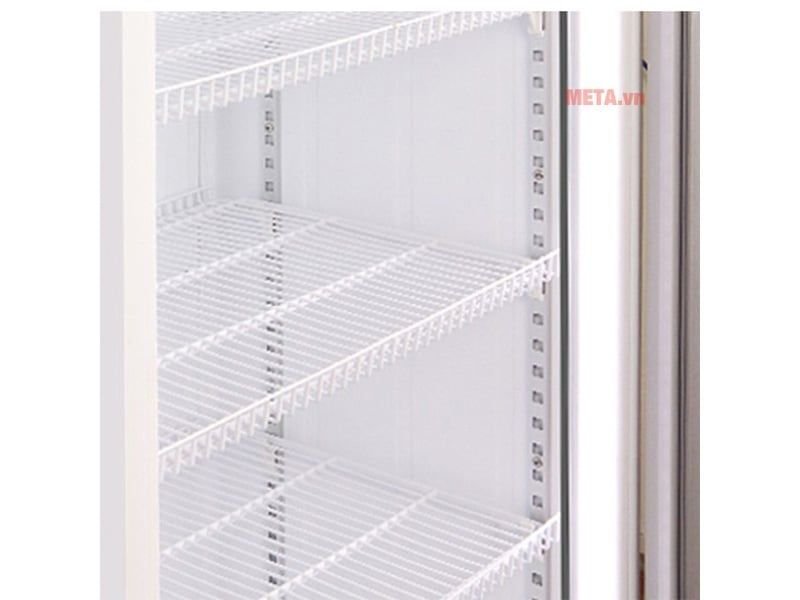 Bên trong, không gian tủ khá rộng rãi cho phép người dùng lưu trữ nhiều thực phẩm. Hơn nữa việc trang bị 4 khay chứa chắc chắn bên trong cũng giúp cho người dùng thuận tiện hơn trong việc sắp xếp thực phẩm. Các khay ngăn đều có thể thay đổi vị trí lắp đặt nên người dùng có thể vệ sinh tủ dễ dàng hơn.