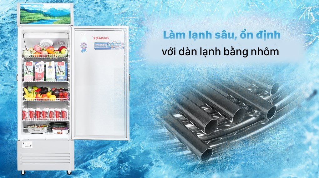 Tủ mát Sanaky được thiết kế với dàn lạnh làm bằng ống nhôm cho hiệu suất dẫn khí tốt giúp các ngăn tủ được giữ lạnh trong một khoảng thời gian dài. Nhờ vậy, thực phẩm được bảo quản lâu dài mà vẫn tươi ngon.